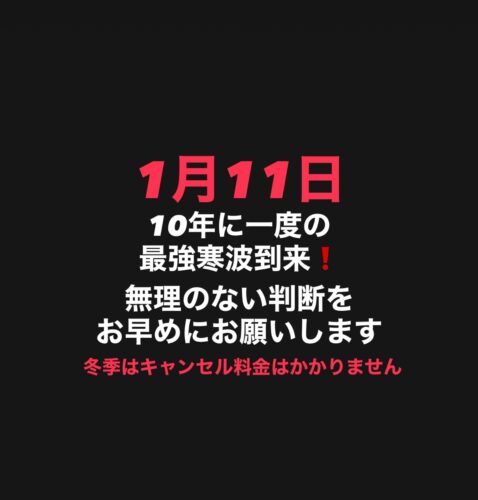 今週末11日は10年に一度の最強寒波が到来いたします。一晩で1mと雪掻きをしたいとテントが潰れる可能性がございます⛄️❄️道中、東海北陸自動車道が通行止めになる可能性もございます‼️ 冬季はキャンセル料金はかかりません。 無理のないご判断をお願い致します🤲